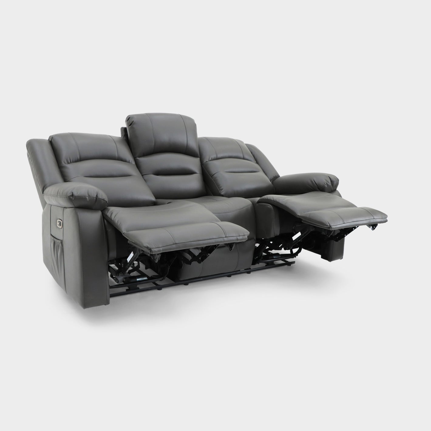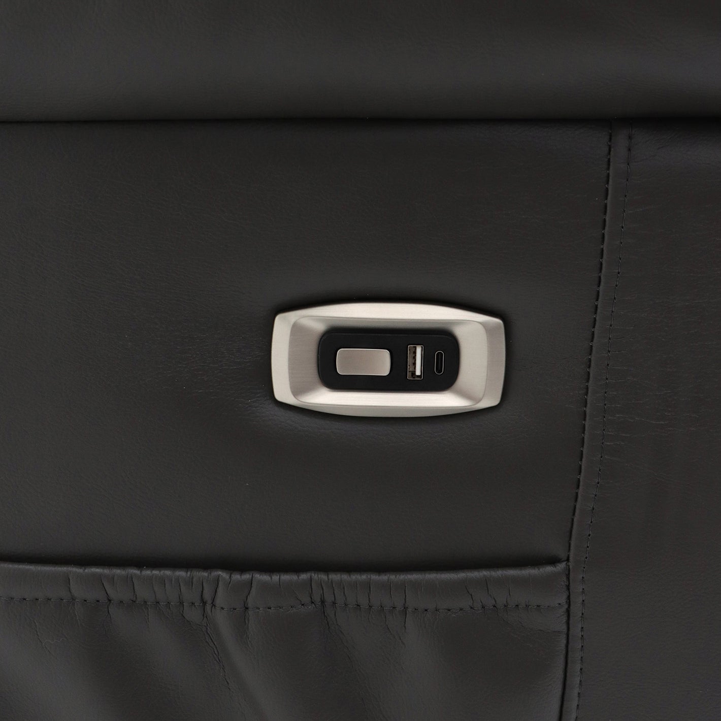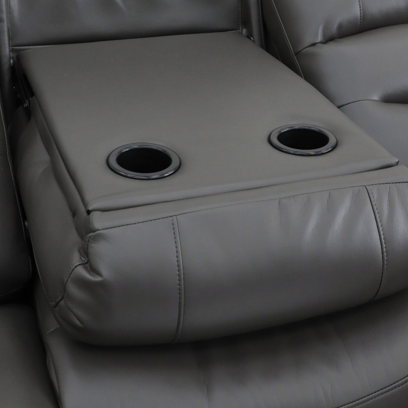 This Alva Electric Recliner Sofa in Grey boasts a contemporary and sleek design, along with an easy-to-use reclining mechanism for finding your desired level of comfort. The plush, faux leather upholstery and generously sized armrests provide additional coziness. It also includes a USB-C charging port, a convenient drop-down table with cup holders, and a practical side pocket for storing items like remote controls and magazines.