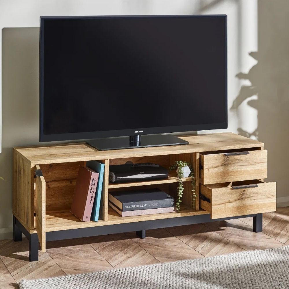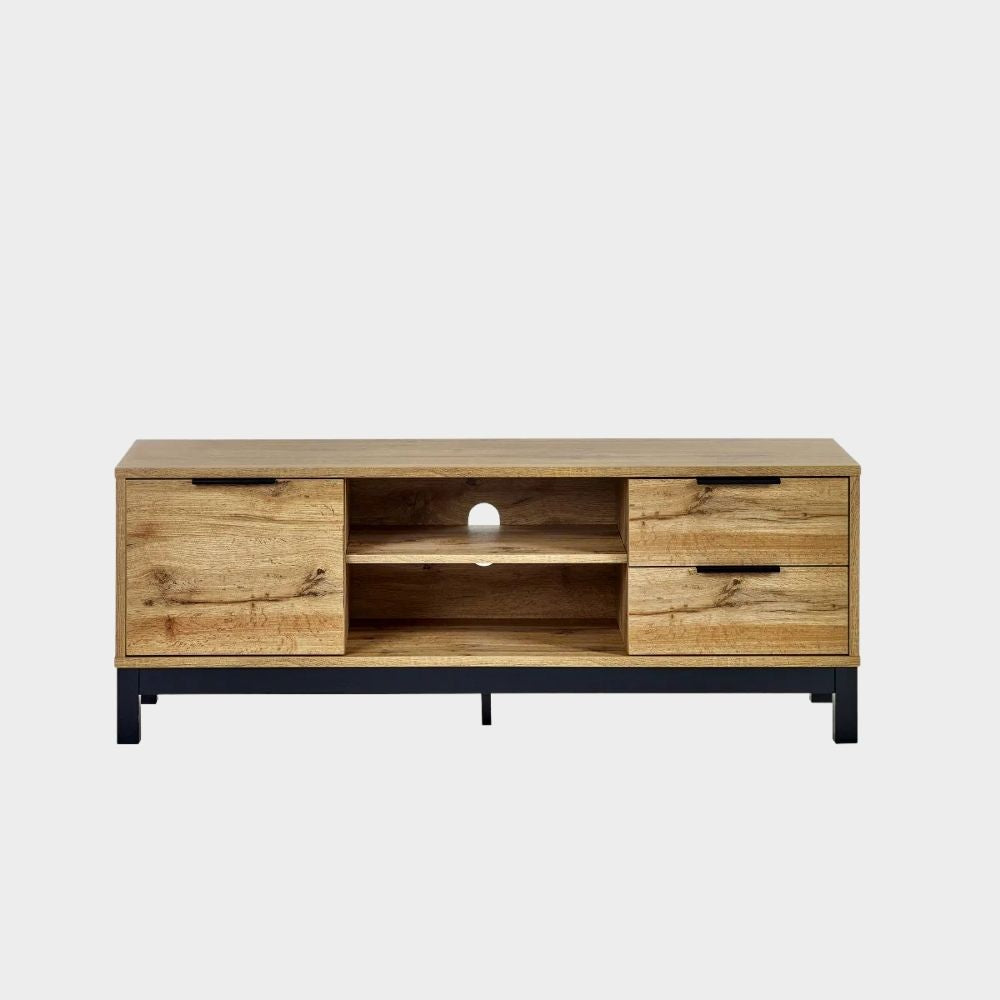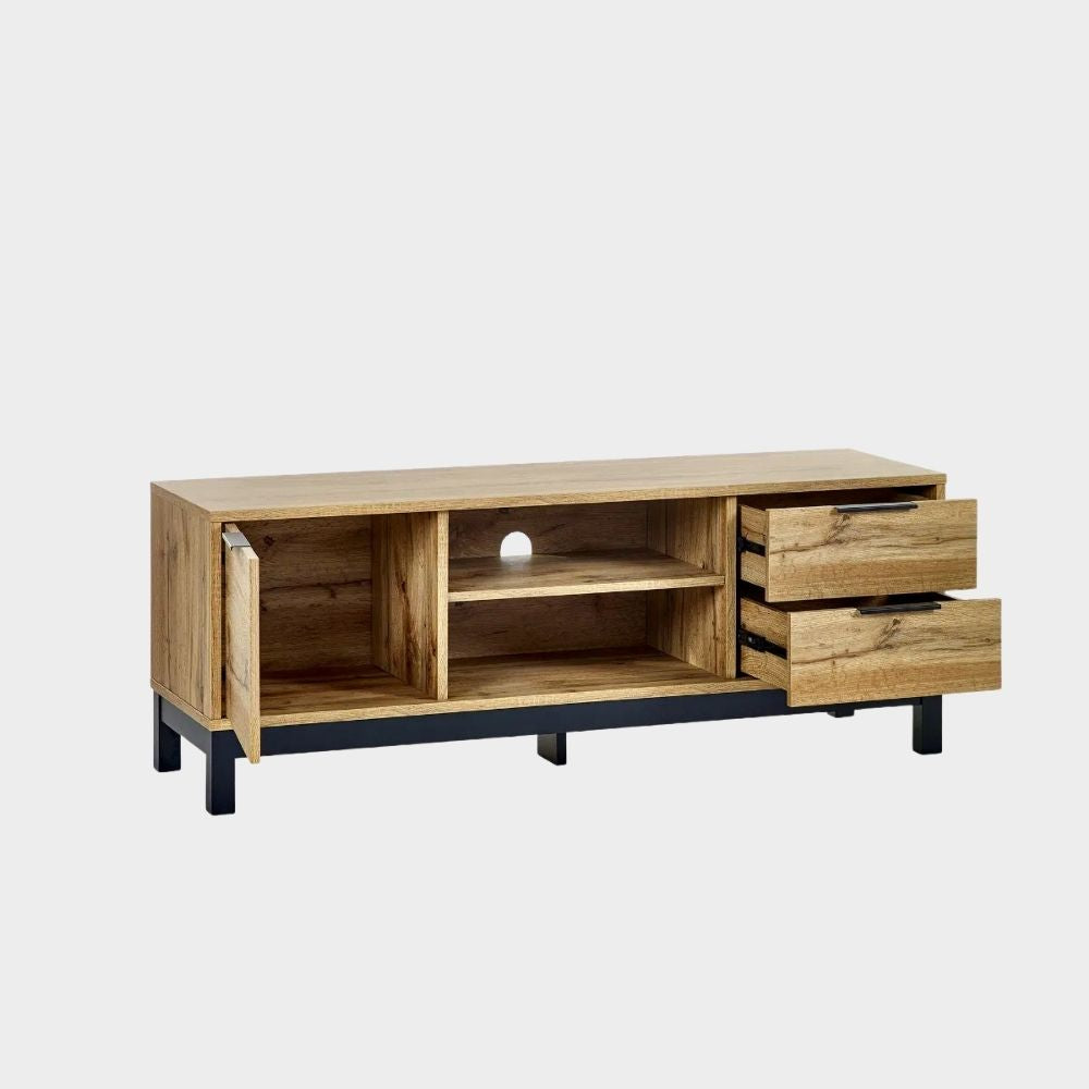 Transform your living space with the Bali TV Unit in Oak, where style meets functionality seamlessly enhanced by revolutionary click furniture technology. The modern oak finish, complemented by contrasting black legs and handles, brings a classic industrial charm to your bedroom. Crafted with precision and using high-quality materials, this unit ensures both durability and low-maintenance upkeep, making it a practical and stylish addition to your interior. With a spacious cupboard and two pull-out drawers, it offers ample storage for all your media essentials, creating an organised and aesthetically pleasing entertainment hub.