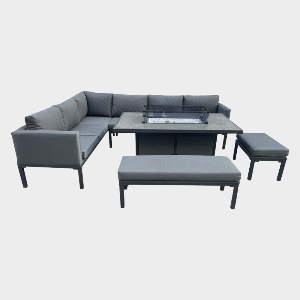 Enhance your outdoor gatherings with the Kensington Garden Furniture Set, featuring a corner sofa, firepit table, and benches. The aluminium frame provides durability while the comfy grey cushions offer optimal comfort for family BBQs. Elevate your patio with this versatile and stylish set.