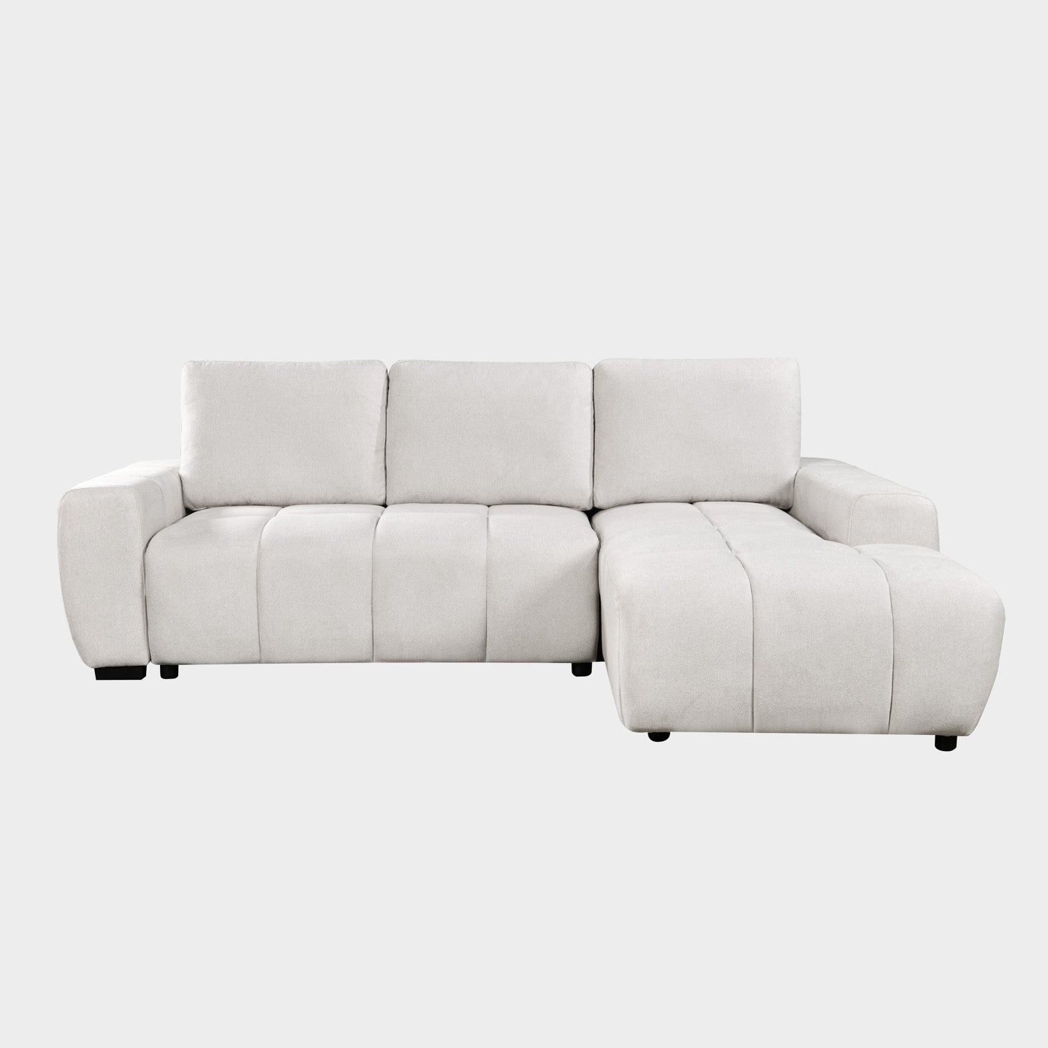 The Lora Sofa Bed Stone Right Hand Facing Corner offers the perfect balance of style, comfort, and functionality. Upholstered in a soft, textured fabric, this sleek, low-profile design is both inviting and effortlessly modern. Wide padded arms, plush channel-tufted cushioning, and generously deep seating provide luxurious relaxation, whether you're lounging or hosting guests. With a simple pull-out mechanism, the Lora transforms seamlessly into a spacious bed — ideal for overnight guests or cozy movie nights with the additional bonus of two separate under seat storage areas. The corner configuration maximises lounging space while maintaining a compact footprint, making it perfect for urban living or multifunctional rooms.