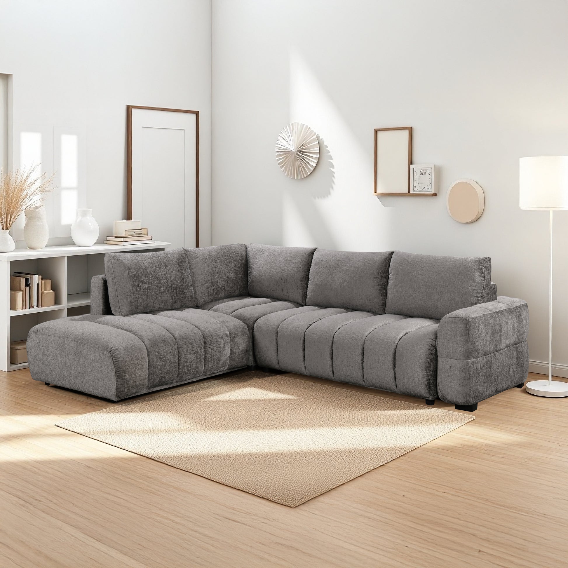 The Oren Left Hand Facing Corner Sofa offers relaxed comfort with a clean, contemporary design. Its corner layout provides generous seating, making it ideal for family living or entertaining. Upholstered in a versatile grey tone, it blends effortlessly into a wide range of interiors. A stylish and comfortable centrepiece for your living space.