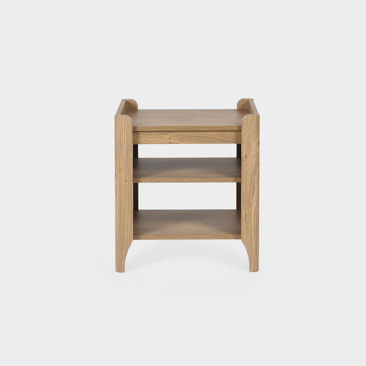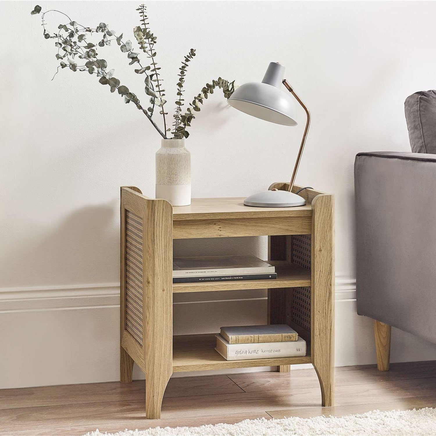 Showcasing a beautifully sleek design with a bohemian feel, the Sunny Lamp Table offers exquisitely curved edging accompanied by a raised lip around the edge providing a practical addition, stunningly combined with a rattan-effect sticker front. Finished with a natural oak effect featuring a removable shelf allowing you to store key essentials both on the top and bottom of the table. All around creating the perfect airy, warm feel within your home. Perfect for modern homes, this piece blends style with everyday comfort. Ideal for adding personality to your space while keeping things practical and on-trend.